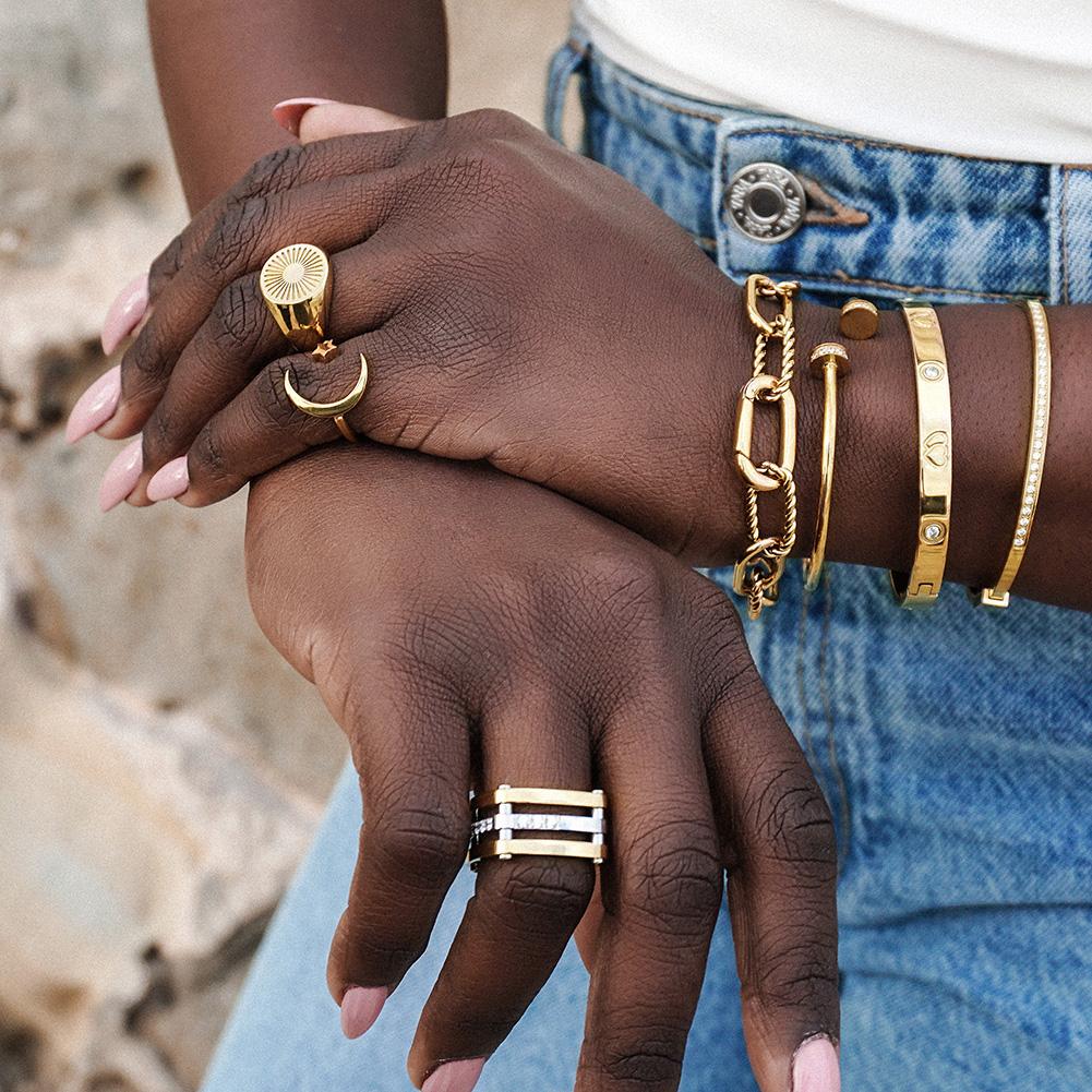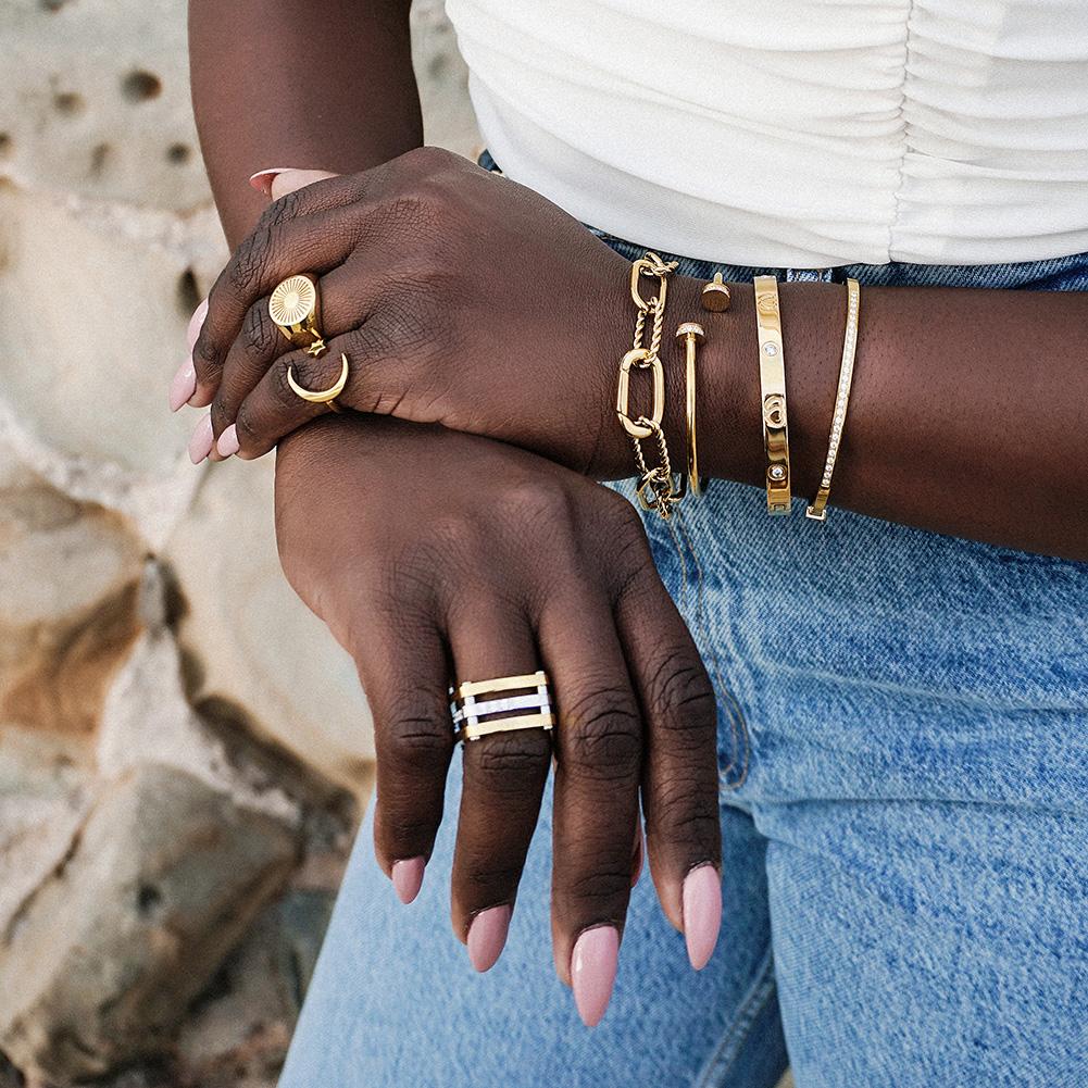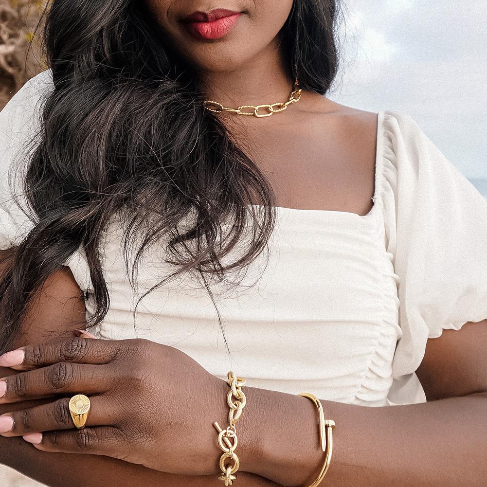 This charming necklaces featuring geometric rectangle metal linked with two different sized . They are definitely a stunning addition to any jewelry collection. It also gives more choices to people who originally liked rectangular metal geometric style necklaces. The chain and the matching bracelet also make great combo gifts for your loved ones. This ring design is inspired by the halo around the sun. No matter what you encounter, you can move forward without fear and with positive thoughts like the sun. The neat design is also very suitable for wearing on any occasion.